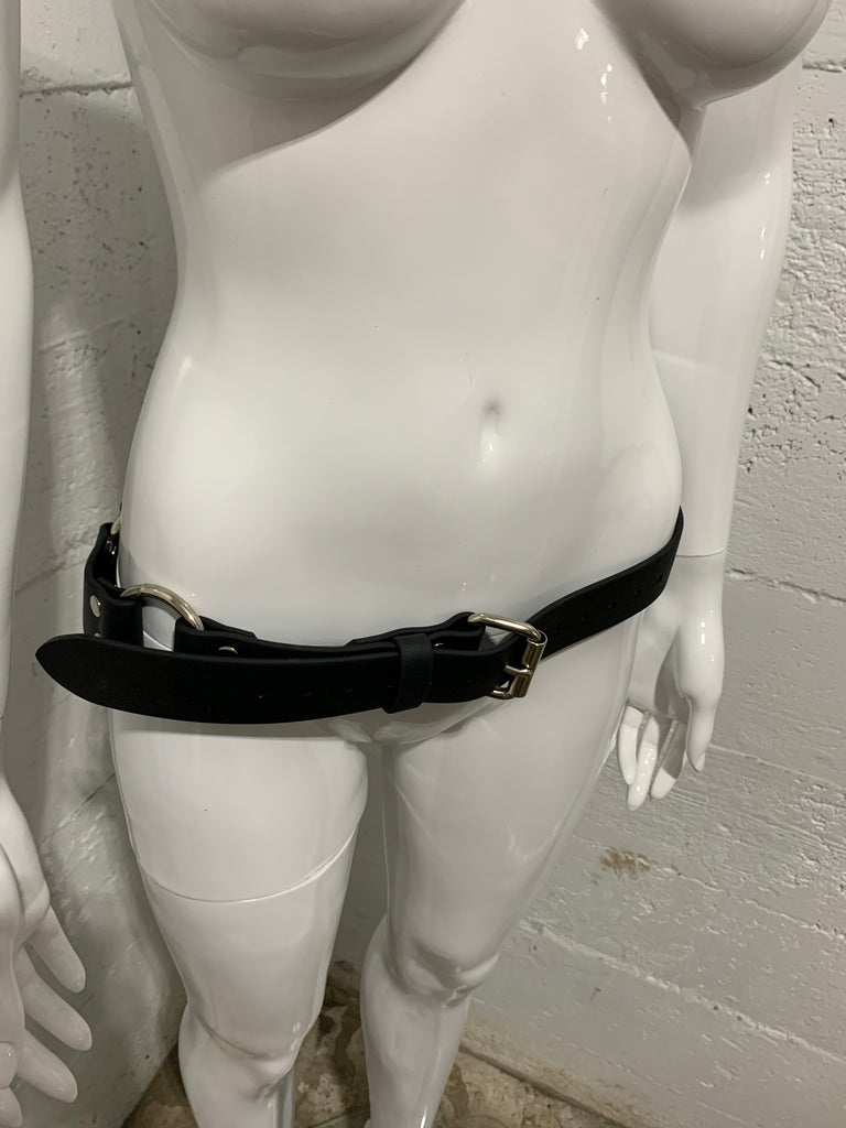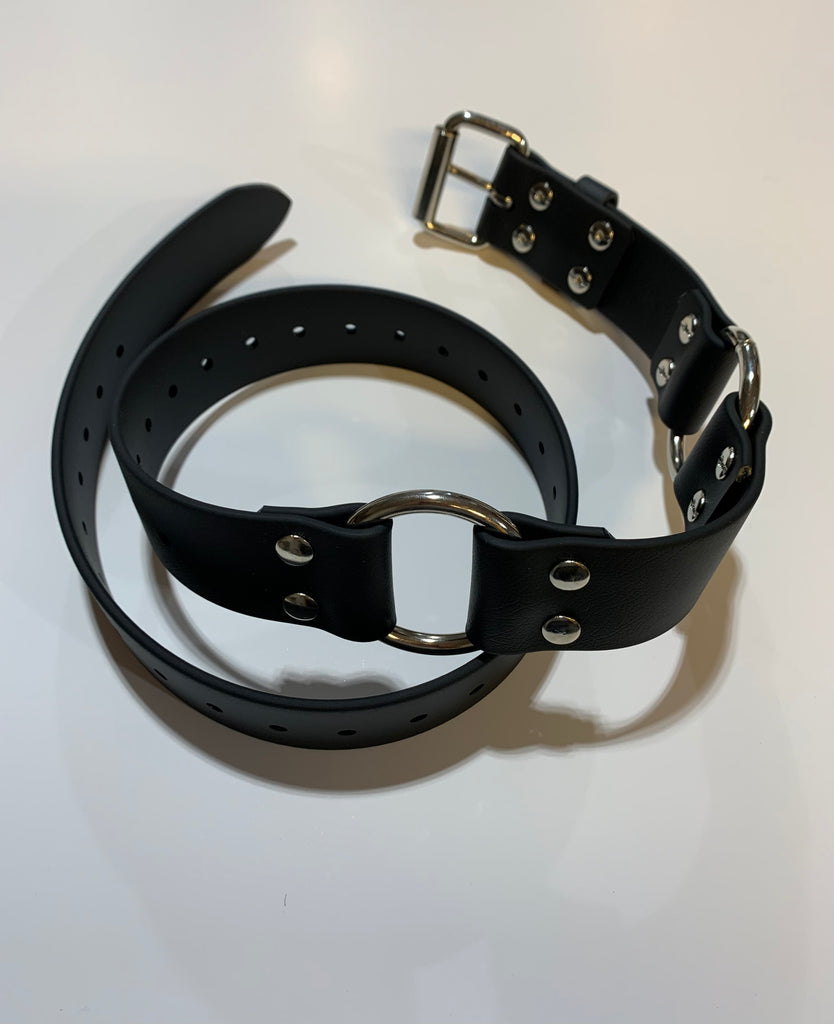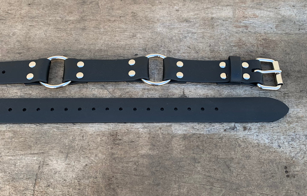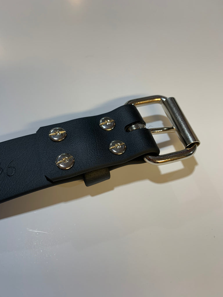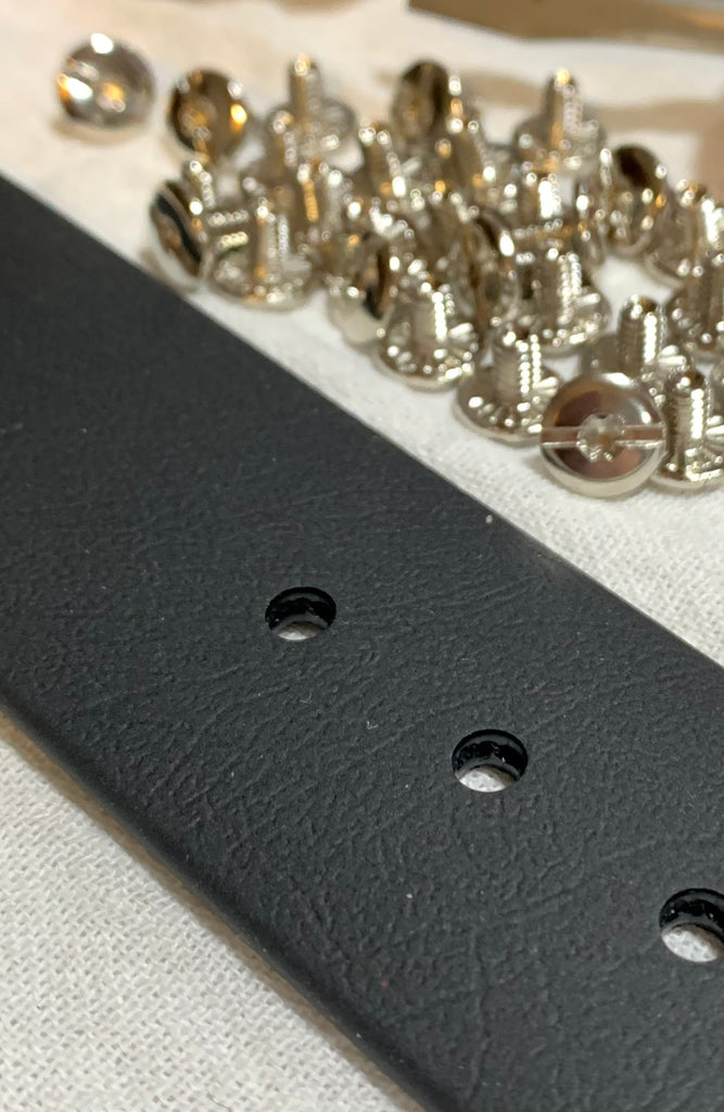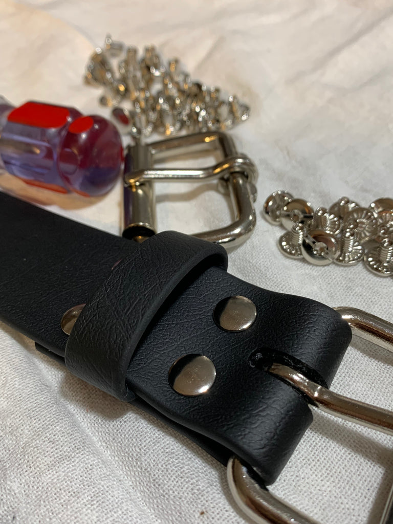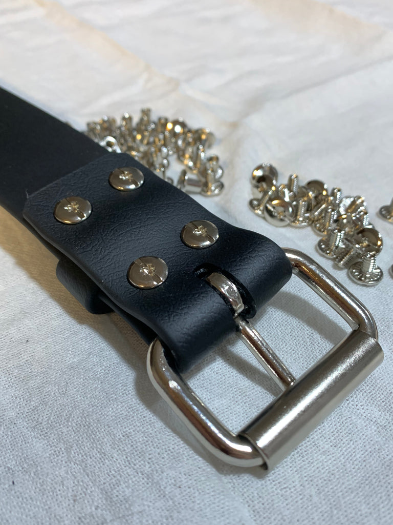 This belt is made with 1.5 inch wide black pvc coated polyester webbing . It has a sturdy chrome plated steel roller buckle closure , that is secured with threaded post (Chicago screws)to allow you to easily change belt buckles.